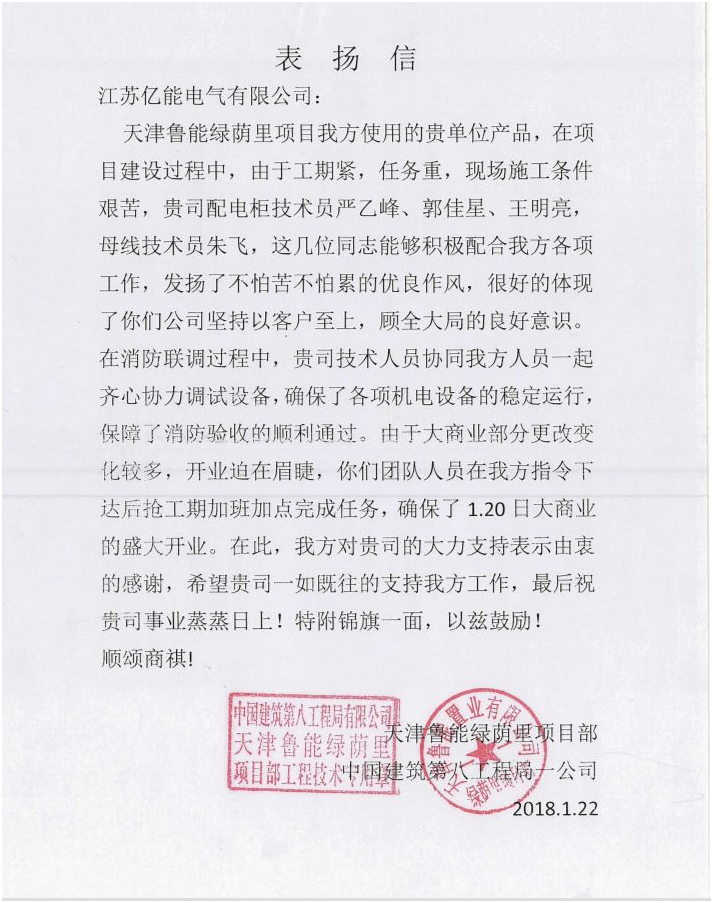客户礼赞 | 天津鲁能向亿能技术服务团队致谢